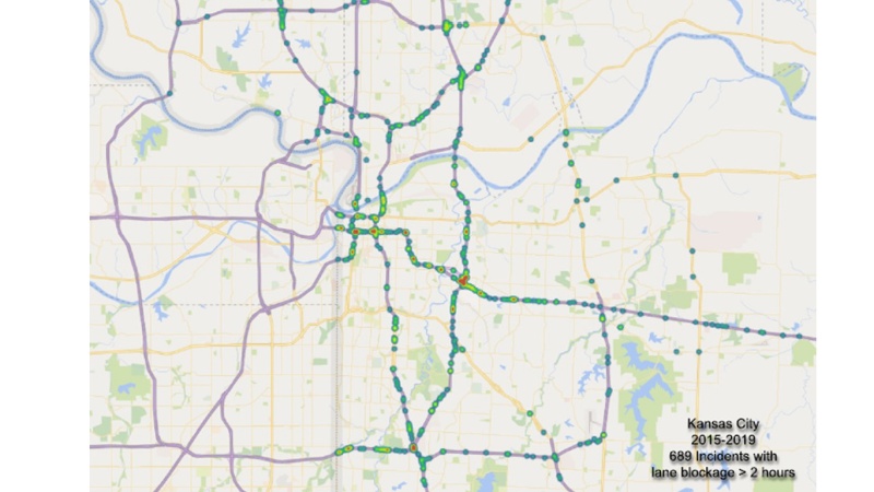 Kansas City recorded 1,853 incidents in the first quarter of 2020. The average time to clear traffic incidents was 19.7 minutes, a decrease of 9.7% from the first quarter of 2019.