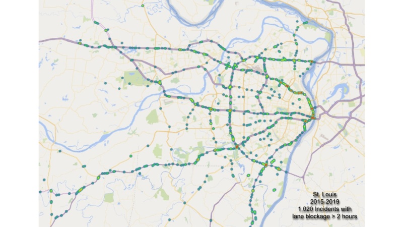St. Louis recorded 2,804 incidents in the first quarter of 2020. The average time to clear traffic incidents was 26.8 minutes, a decrease of 11.8% from the first quarter of 2019.