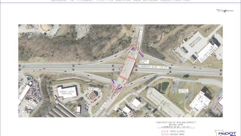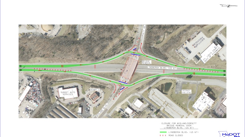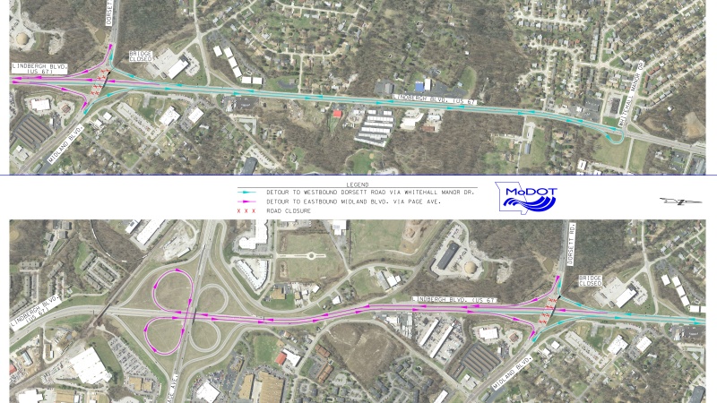 During the closure, there will be posted detours for Lindbergh traffic. Southbound traffic will be able to exit at Dorsett but will have to detour at Page and loop back around to northbound Lindbergh to access Midland. Northbound traffic will be able to exit at Midland but will have to use Whitehall Manor to access southbound Lindbergh to access Dorsett.