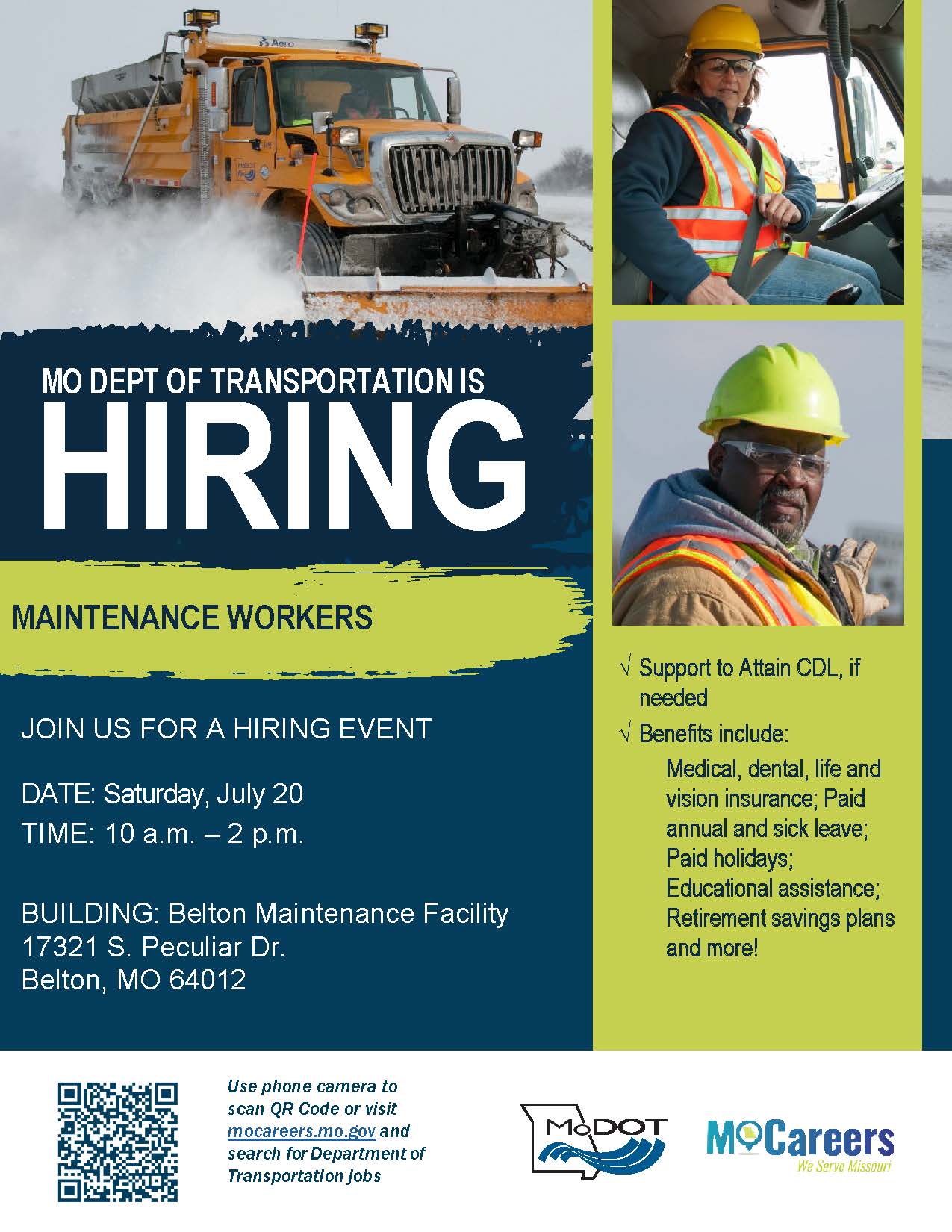 • At this event, MoDOT KC will be hiring for maintenance workers. You can complete your application ahead of time at modot.org/careers.