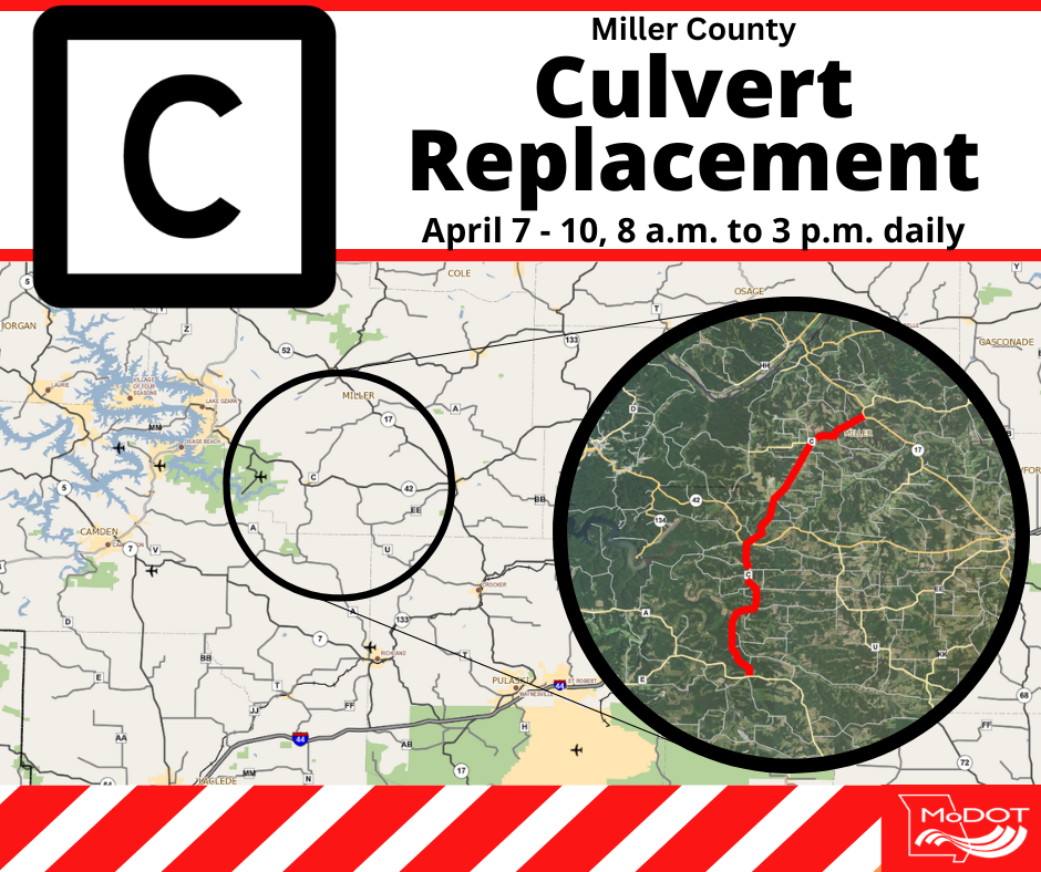 JEFFERSON CITY, Mo. – Local crews with the Missouri Department of Transportation plan to close Miller County Route C, both north and south of Missouri Route 42, next week to replace several culverts. From 8 a.m. to 3 p.m. daily, April 7 - 10, Route C will close from Route A to Missouri Route 17. The roadway is expected to reopen each afternoon. All work is weather-permitting, and schedules are subject to change.