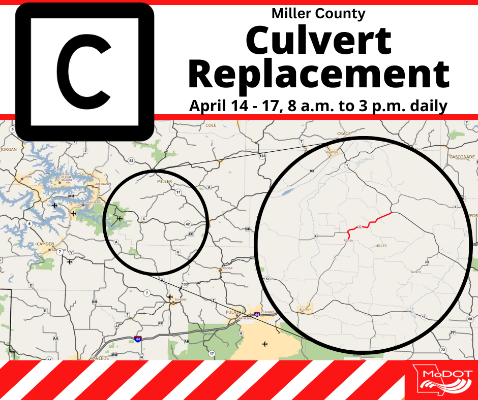 JEFFERSON CITY, Mo. – Local crews with the Missouri Department of Transportation plan to close Miller County Route C again next week to continue the replacement of several culverts. From 8 a.m. to 3 p.m. daily, April 14 - 17, Route C will close from Ullman to Missouri Route 17. The roadway is expected to reopen each afternoon. All work is weather-permitting, and schedules are subject to change.