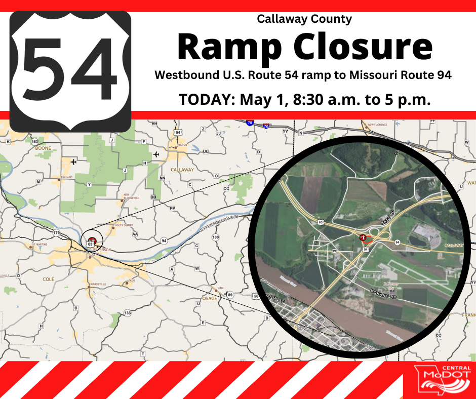 JEFFERSON CITY, Mo. – A washout has prompted the closure of the ramp from westbound U.S. Route 54 to eastbound Missouri Route 94 today, Thursday, May 1. Crews from the Missouri Department of Transportation (MoDOT) are making emergency repairs to the roadside and affected pavement. The ramp should reopen this afternoon, weather permitting. During the closure, motorist should continue to Route W (Airport Road) to access eastbound U.S. Route 54, then exit onto eastbound Route 94.