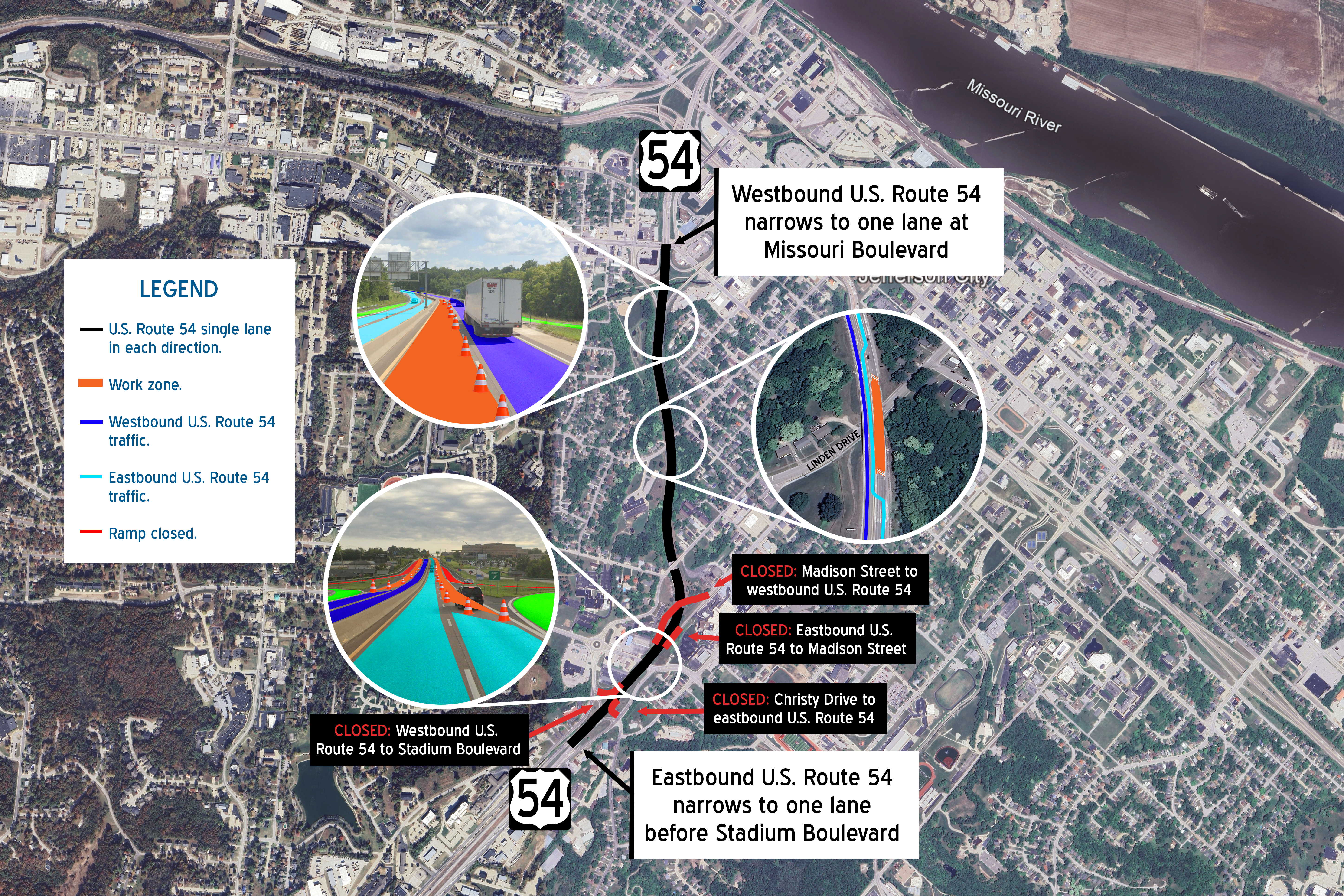 As with the first phase, traffic delays on U.S. Route 54 could stretch for several miles at peak daily commute times and weekend travels. All work is weather permitting and schedules are subject to change.
