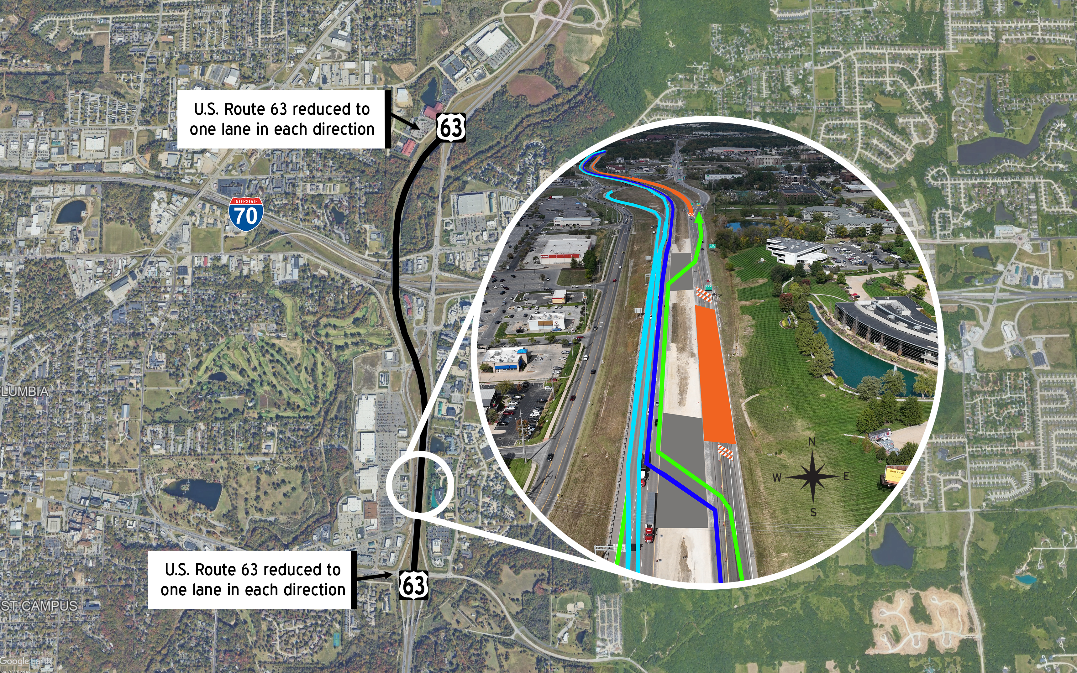 Those who travel this area frequently, particularly southbound motorists, will see little change as entering and exiting the work zone will remain the same. However, northbound motorists continuing north on U.S. Route 63 will need to remain in the left lane between the Broadway overpass and the Conley underpass. The right lane will change to exit only to the I-70/U.S. Route 63 connector.