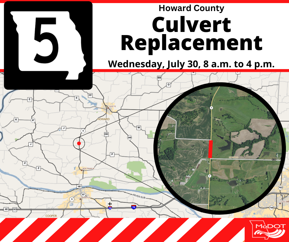 JEFFERSON CITY, Mo. – An emergency culvert replacement will close a short segment of Missouri Route 5 tomorrow between New Franklin and Fayette. Local crews with the Missouri Department of Transportation plan to close Route 5 between County Road 426 and County Road 320 from 8 a.m. to 4 p.m. on Wednesday, July 30.