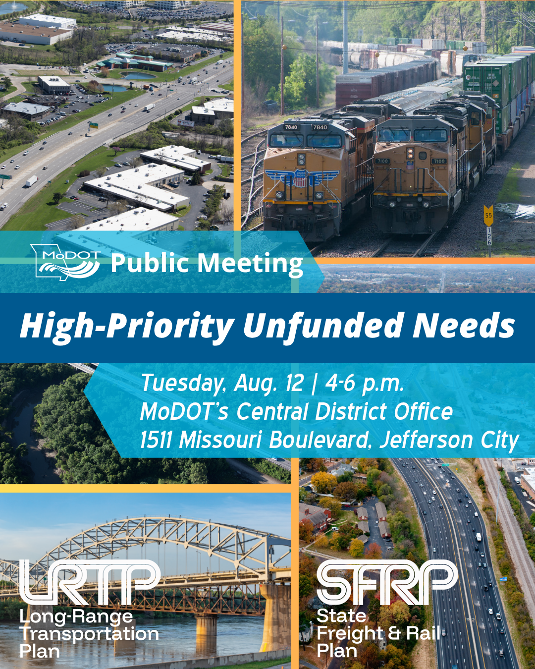 The public is invited to review the list and provide feedback on the order of priorities and additional needs that could be funded in the future. A meeting to discuss the draft High-Priority Unfunded Needs list and the LRTP and SFRP updates in Central Missouri will be held Tuesday, Aug. 12, 2025, from 4 to 6 p.m. at MoDOT’s Central District Office, located at 1511 Missouri Boulevard, Jefferson City. The presentation materials and a comment form are also available online at: https://www.modot.org/high-priority-unfunded-needs-public-meetings.