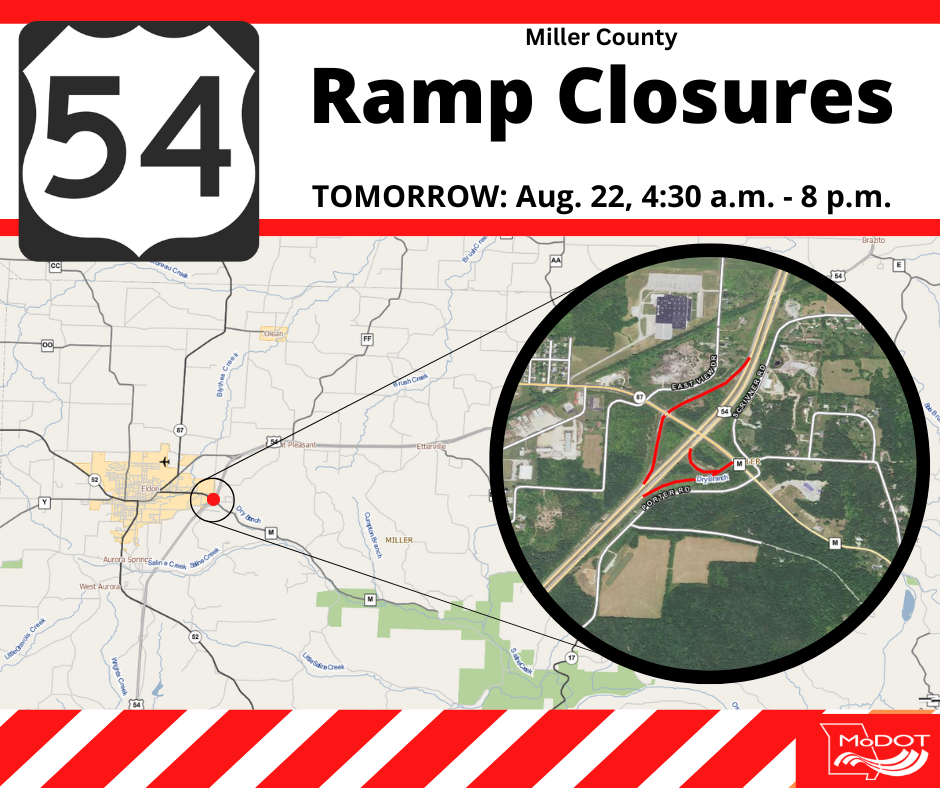 JEFFERSON CITY, Mo. – Crews working on a resurfacing project on U.S. Route 54 in Miller County will close the ramps, one at a time, at the Missouri Route 87 interchange in Eldon tomorrow, Friday, Aug. 22, between the hours of 4:30 a.m. and 8 p.m.