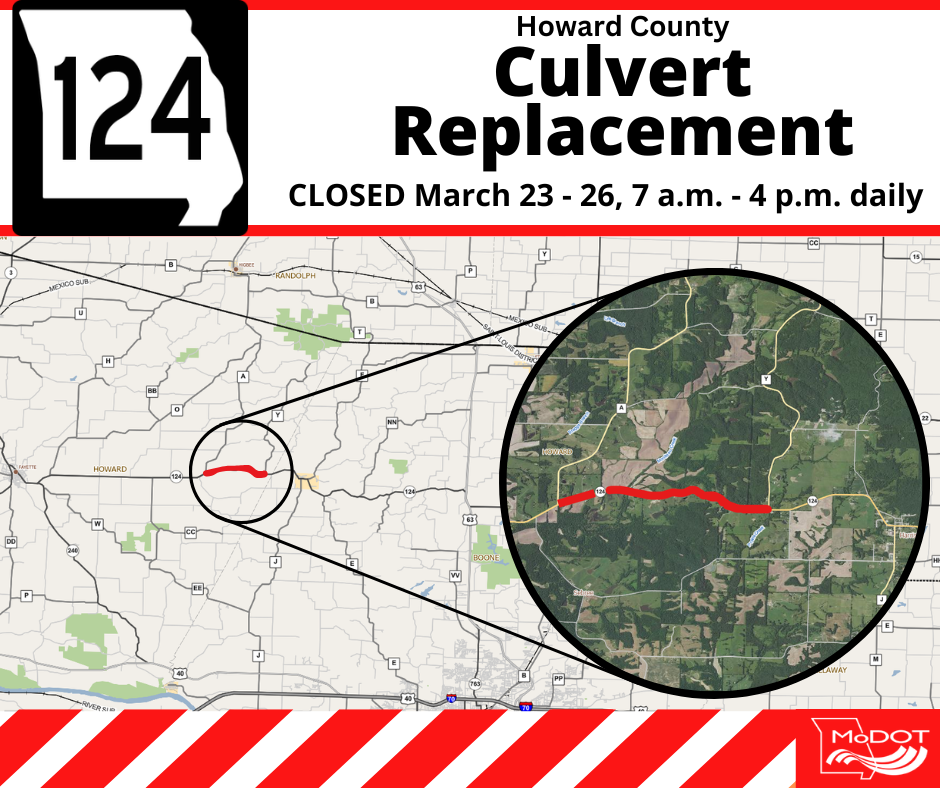JEFFERSON CITY, Mo. – Local crews with the Missouri Department of Transportation plan to close Missouri Route 124 in Howard County next week to replace a culvert. From 9 a.m. to 5 p.m. on Wednesday, March 18, crews plan to close Route 124 west of Harrisburg, between Howard County Routes A and Y. Changeable message boards are in place to alert drivers of the upcoming closure.