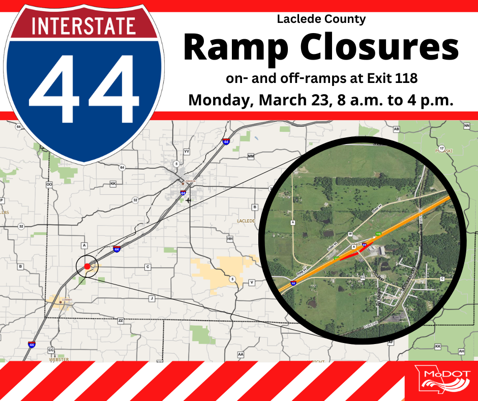 JEFFERSON CITY, Mo. – Local crews with the Missouri Department of Transportation plan to repair the right-hand (driving) lane of Interstate 44 around Exit 118 near Phillipsburg on Monday, March 23. For the safety of both motorists and roadway workers, both the eastbound on- and off-ramps at Exit 118 will close from 8 a.m. to 4 p.m.