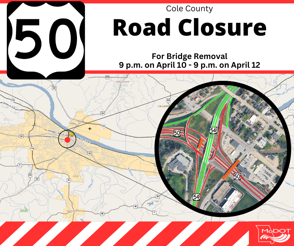 From 9 p.m. on April 10, 2026, to 9 p.m. on April 12, 2026, construction crews working with the Missouri Department of Transportation plan to demolish and remove the trilevel bridge over U.S. Route 50 that is no longer in use. Since closing in 1991, this bridge has deteriorated, and there are concerns about potential debris. It makes more sense economically to remove it than to spend funds repairing and maintaining it.