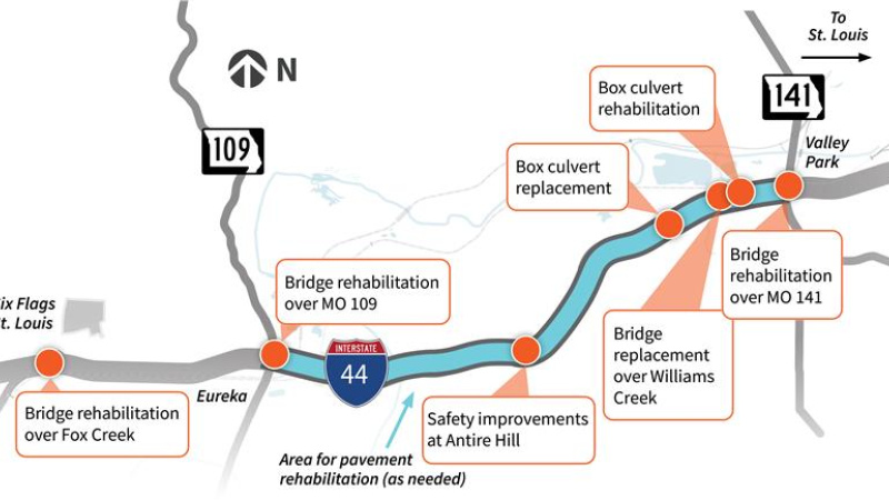 - Fixing the pavement and roadway surface where needed along I-44 between Eureka and Valley Park.