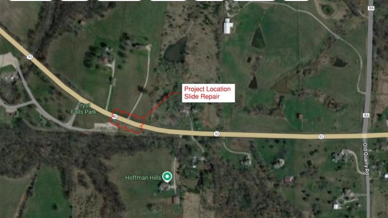 Slide repair operations will take place on the south side of Missouri Route 92 near Kearney. The project is to replace the existing slope.